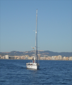 Photo is Pure Spirit leaving Fuengirola after a night anchored off the beach